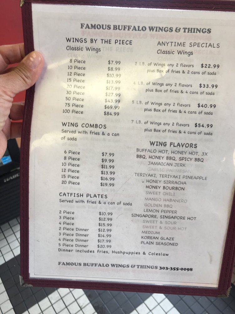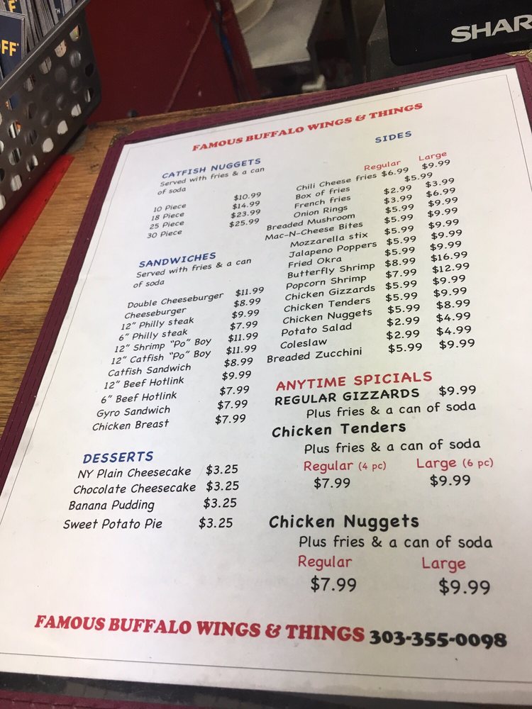 Introducing the menu at Famous Buffalo Wings & Things, where bold flavors meet casual dining. Located at 8208 E Colfax Ave, Denver, this eatery specializes in mouthwatering chicken wings, offering a selection of 23 delectable sauces to cater to every palate. Their signature Buffalo Wings Combo allows you to experience crispy perfection, tossed in your choice of sauce, served alongside golden fries and a refreshing soda.
